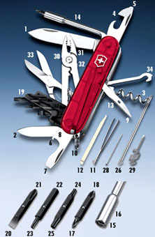 1. ラージブレード/2. スモールブレード/3. コルク栓抜き/4. 缶切り/5. 缶切りーマイナスドライバー3mm(フィリップス型2-3にも対応)/6. 栓抜き/7. 栓抜きーマイナスドライバー(6mm)/8. 栓抜きーワイヤーベンダー、ストリッパー/9. リーマー、ストリッパー/10. キーリング/11. ピンセット/12. ツースピック/13. ソーイングアイ/14. レンチ/15. 5mmヘックスドライバー(D-Subコネクター用)/16. 4mmヘックスドライバー(ビット用)/17. ポジドライブビット0/18. ポジドライブビット1/19. ビットケース/20. スロットビット4mm/21. フィリップスビット/22. ヘックスビット4mm/23. トルクスビット8/24. トルクスビット10/25. トルクスビット15/26. ボールペン/27. ボールペンーディップスイッチ設定に使用/28. ピン/29. 眼鏡用ドライバー1.5mm(特許)/30. プライヤー/31. プライヤー-ワイヤーカッター/32. プライヤーー端子つぶし/33. はさみ/34. ルチフック全長 91mm / 重量 157g